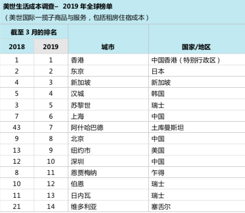 中国大陆城市中以上海的生活成本最高,位列第六。北京和深圳分别位于榜单的第8和第10位。三座城市的成本排名均较上一年有所爬升。此外,纽约排名第9,伦敦则滑落了四位、排名第23。