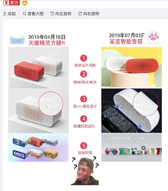 被指抄袭的是小度智能音箱Play。该款产品与今年4月发布的“天猫精灵方糖R”存在5处高度雷同,疑似抄袭。在微博上,天猫精灵还发布了一张全面对比图,指出两款产品在设计风格、面板设计元素、功能按键等多处“撞脸”,且配色方案同为红白双色,甚至在尺寸上也相当接近。