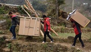 在中国的很多小县城,居民大多自建楼或小区,楼梯狭小,大号家电没法搬上门,京东大家电的配送员和顾客想了许多办法。在云南省巧家县的一户人家,配送员和客户一起叫来了一辆大型起重机,硬生生把一台大号冰箱吊到了5楼阳台入口,成功搬进了家门。“站在楼下看,庞然大物在空中被吊起的瞬间,突然感觉送一台家电真是非常不容易。”配送员说到。