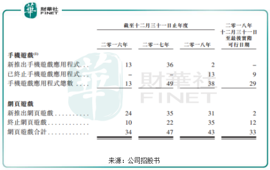 上图可看到,2017年,中至科技新推出的手机游戏应用程式和网页游戏增长喜人,分别达到了36和35款,而当年手机游戏应用程式没有一款是被终止的,网页游戏终止了22款。但到了2018年,中至科技新推出的手机游戏应用程式仅为2款(处于生命周期阶段后期),网页游戏减缓至31款,2018年底至最后实际可行日期,更是仅推出2款网页游戏。