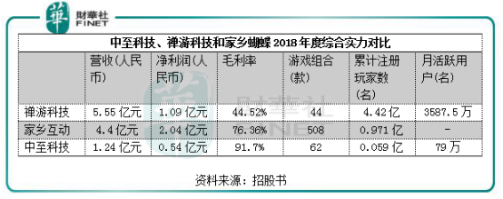 通过对比近期上市的禅游科技和家乡互动2018年度在业绩、手游组合、累计注册玩家数目等方面,发现中至科技综合竞争力是相当弱的,除了毛利率表现优异外,中至科技的体量和市场影响力显然非常弱小。