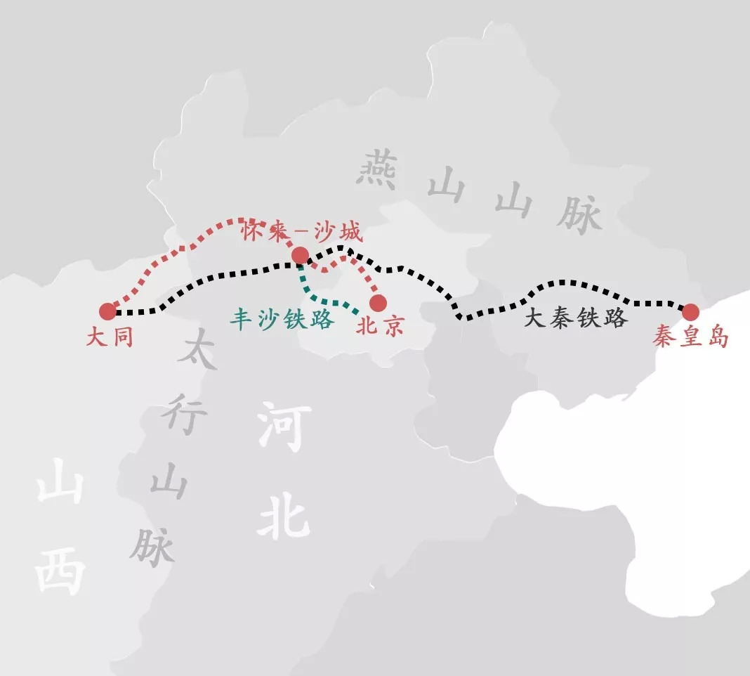 其南侧的丰沙铁路(一部分沿G109国道)就是一例。此线路虽然没有经过军都陉主线,但是囿于太行山地形的原因,永定河峡谷中的雁翅站到邢家堡站上下只能分行。由此也可以看出穿越太行山的难度。其北侧则是大秦铁路,这条重载运煤专线,大力减少了其他线路的煤运压力。