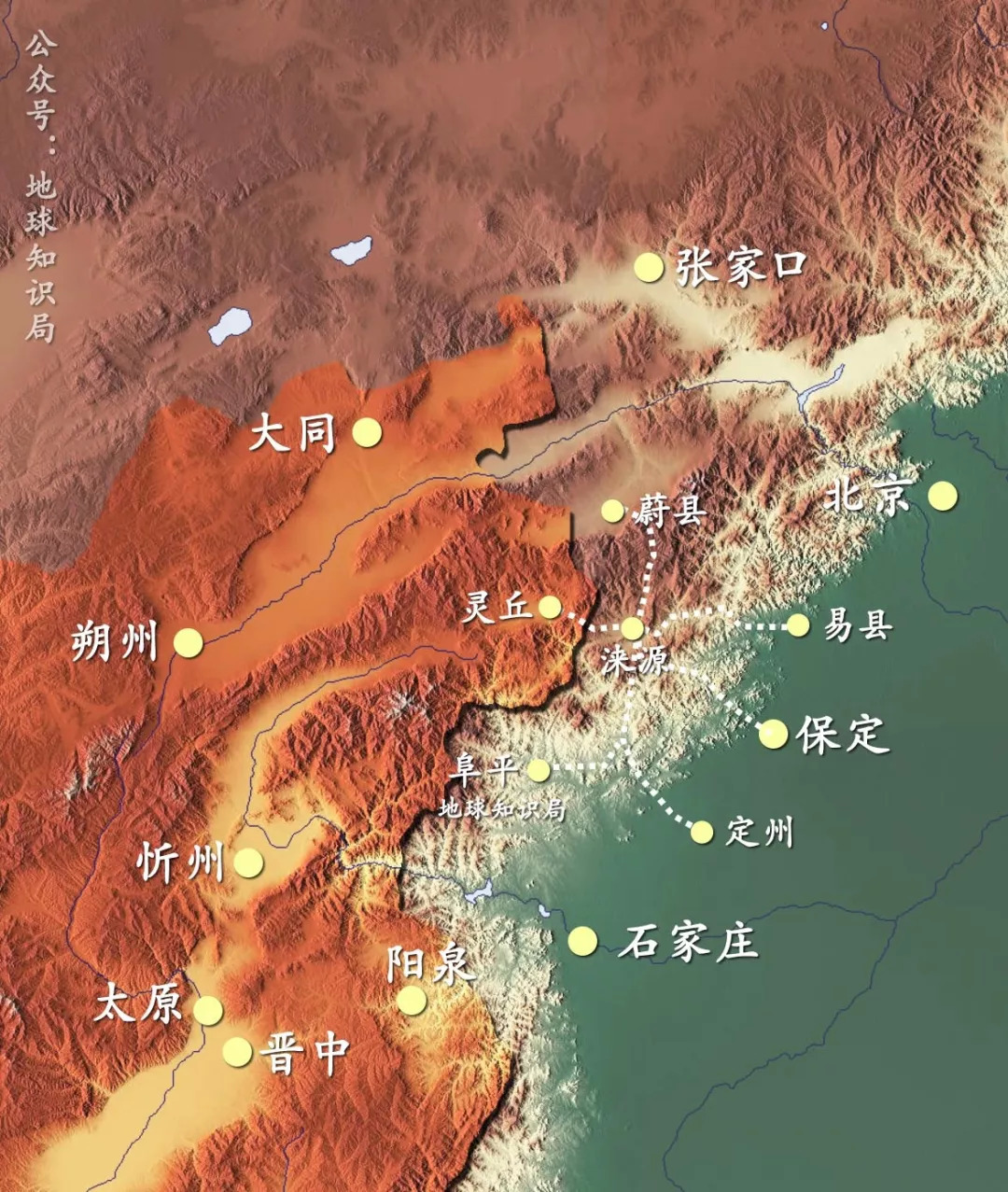 除了以涞源为核心,另一处则是以灵丘为核心,为山西灵丘沿唐河经走马驿、倒马关至保定的唐河道,在今日大体对应G336国道。