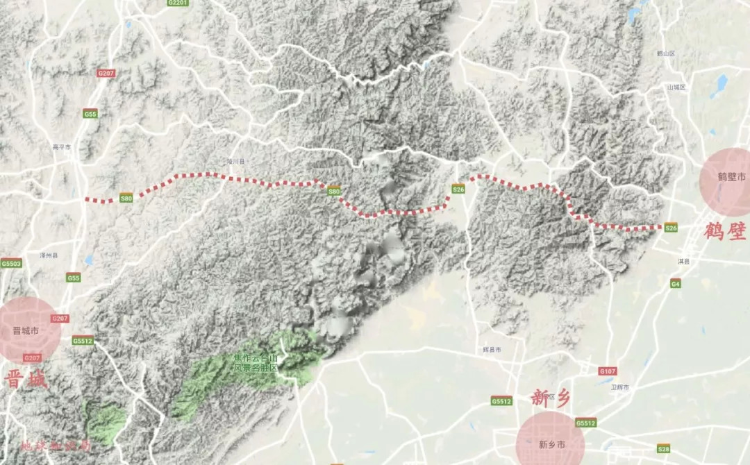 但也不代表容易修建,其所对应的的省级高速,晋S80侯陵高速+豫S26台辉高速(原范辉高速)的穿山路段,鹤壁-辉县市境-豫晋界,控制性路段有王莽岭、万仙山等复杂地段,修建了将近十年,至今仍未通车。