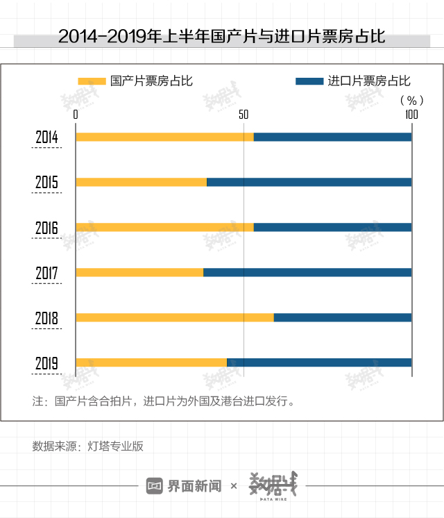 从票房类型来看,今年上半年又是国产片的“小年”,国产片票房占比为44.69%,不及进口片。