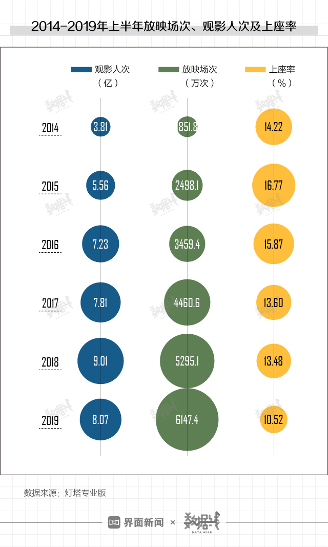和票房同样减少的,还有观影人次。根据灯塔专业版,虽然2019年上半年放映场次较去年同期增加了超800万场,但观影人次下降了近1亿人次,2019年上半年观影人次仅为8.07亿。