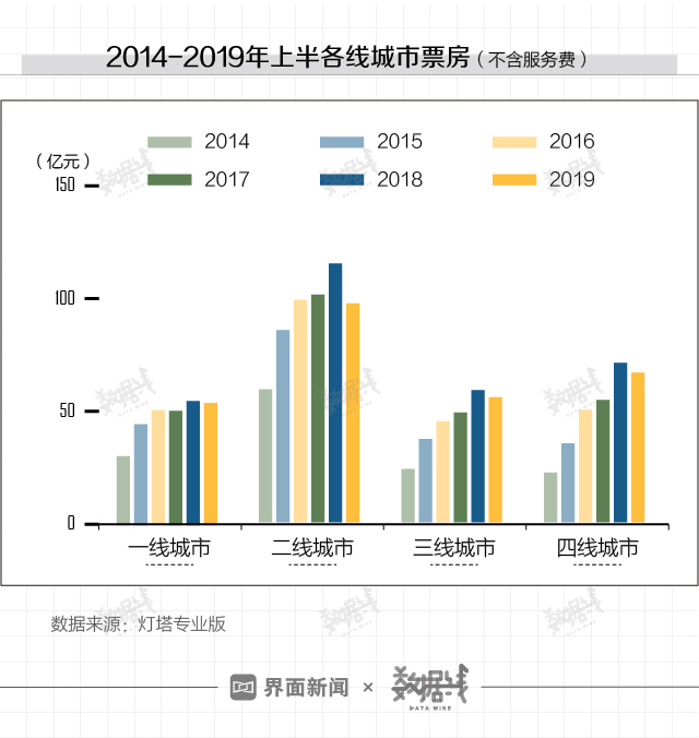 从城市来看,下沉市场也正在“失灵”。2019年上半年,二、三、四线城市上票房(不含服务费)都较2018年同期出现明显下降。