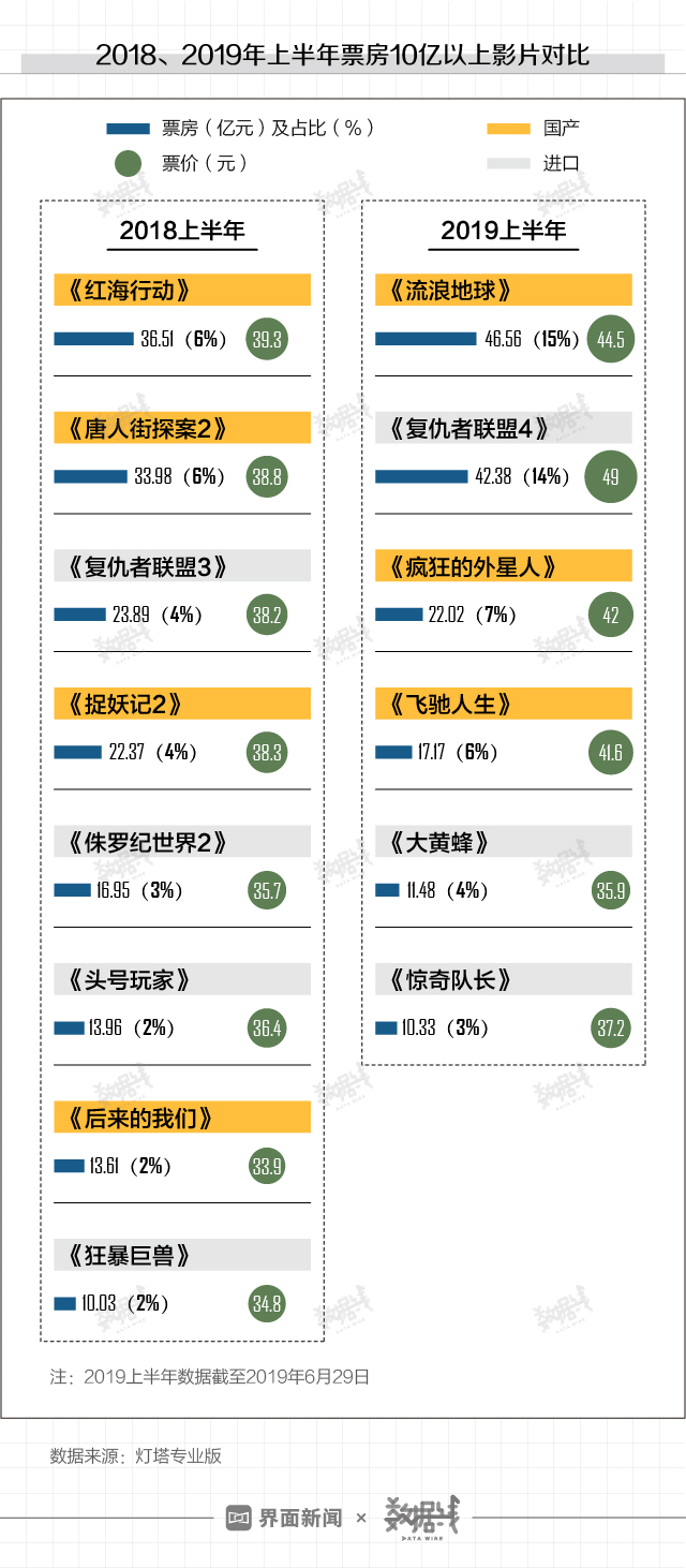 从影片内容来看,虽然头部电影表现出色,《流浪地球》和《复仇者联盟4》两部40亿票房量级的电影分享了2019年上半年29%的票房。但腰部影片乏力,2019年上半年票房10亿以上的影片数量明显减少。