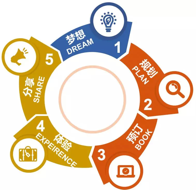每位新生Y世代旅行者的确切购买路径是多样化的。但是,从梦想到目的地的阶段对每位旅行者来说都是一样的,它包括:梦想->规划->预订->体验->分享。