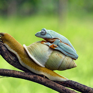 懒到走不动路的爪哇树蛙,在看到一只缓慢爬行的小蜗牛后,毫不犹豫地骑了上去。也算是搭了世界上最慢的顺风车。