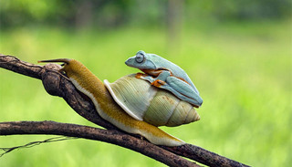 酷暑来临,湿热让最短的距离步行起来都变得很艰难。于是,印度尼西亚一只超级懒的小树蛙想了一个损招,占了它老实巴交的好朋友小蜗牛的便宜。