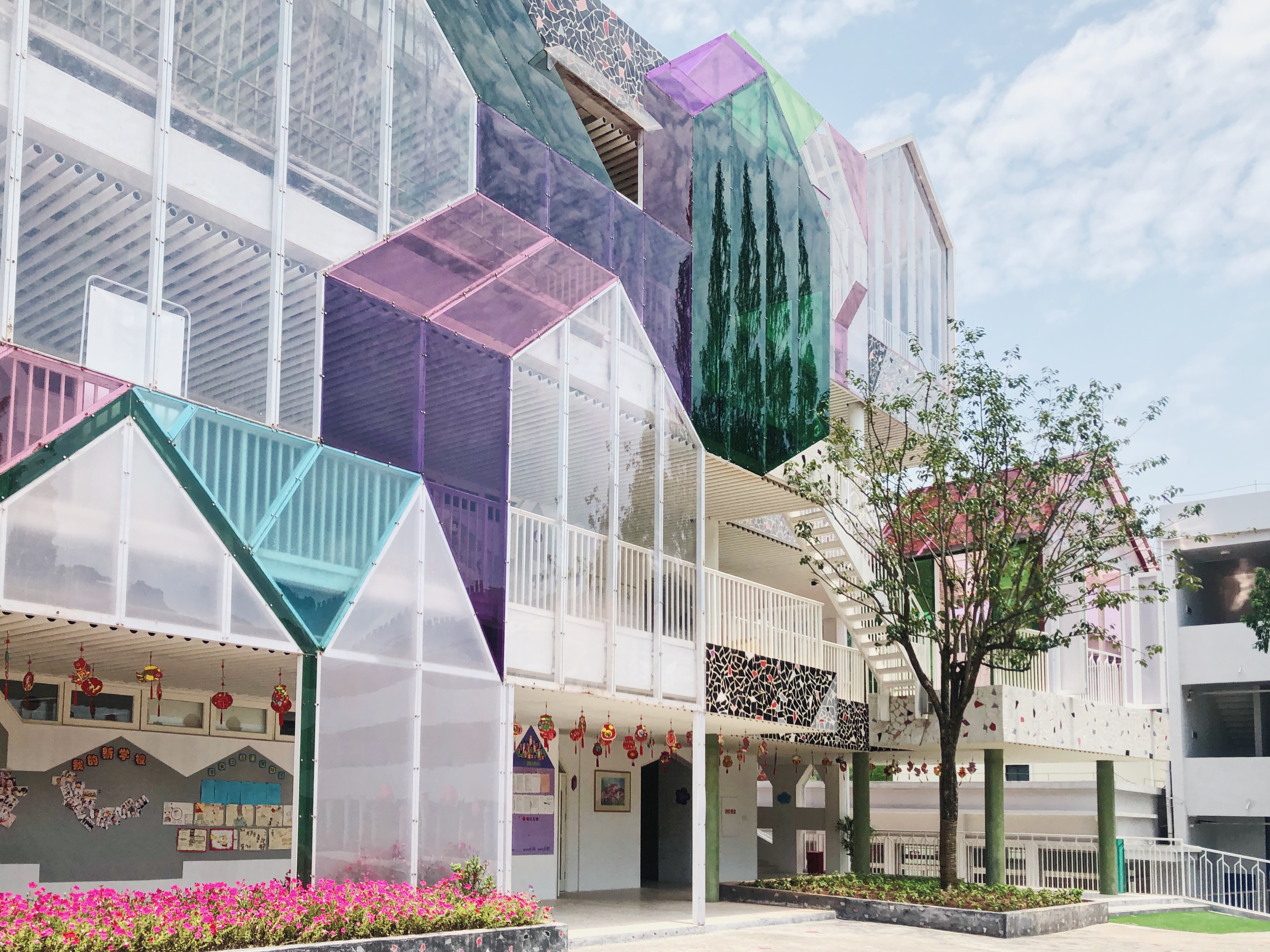 建筑师在原有教学楼走廊的外侧加设了钢结构,加宽了原来狭窄的走廊,在教学楼的西侧搭建了用于课外活动和户外活动的空间,先是有屋顶的风雨操场,接着是一层水池,涂成浅绿色像竹子的细长柱子托起几个位于二层的彩色活动空间,而后是层叠的增设的尖顶小房间,里面放着陶艺、手工的用具,设置了舒适的“小窝”与“树屋”空间,在小屋之间结合儿童玩耍的需要设置攀爬绳网、攀岩斜坡和楼梯配合使用。