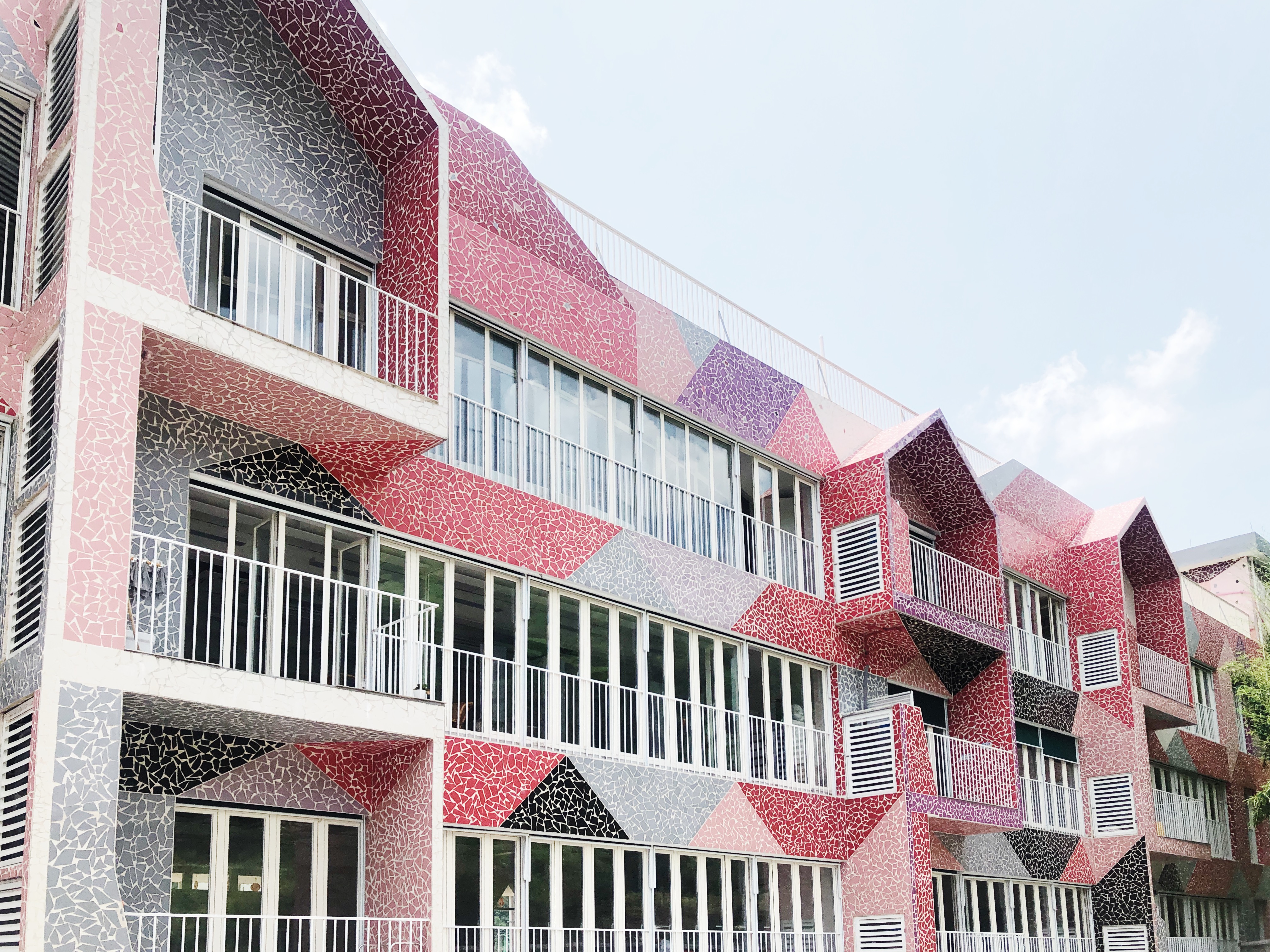 靠近建筑本身才明白它不同于照片的巧妙。照片无论如何拍摄都有把三维画面拍平成二维的视错觉。在现场,三维和二维亦幻亦真的感觉更加强烈。它像埃舍尔的画着了保罗·克利的颜色,18种颜色的PC板与8种颜色拼色的碎瓷片构成了丰富的视觉效果,图形组合切换,处于不同的距离看这座建筑会产生不同的立体感认知。许多人用二维图像画出模仿三维的效果,可这座建筑有时把三维的小屋悄悄扭转一个很小的角度取得于二维的图像一致的效果,它既是一栋建筑,又如同许多靠近的建筑,形成了幽默而有趣的特殊效果,被称为“山村微城”——给孩子的小城。