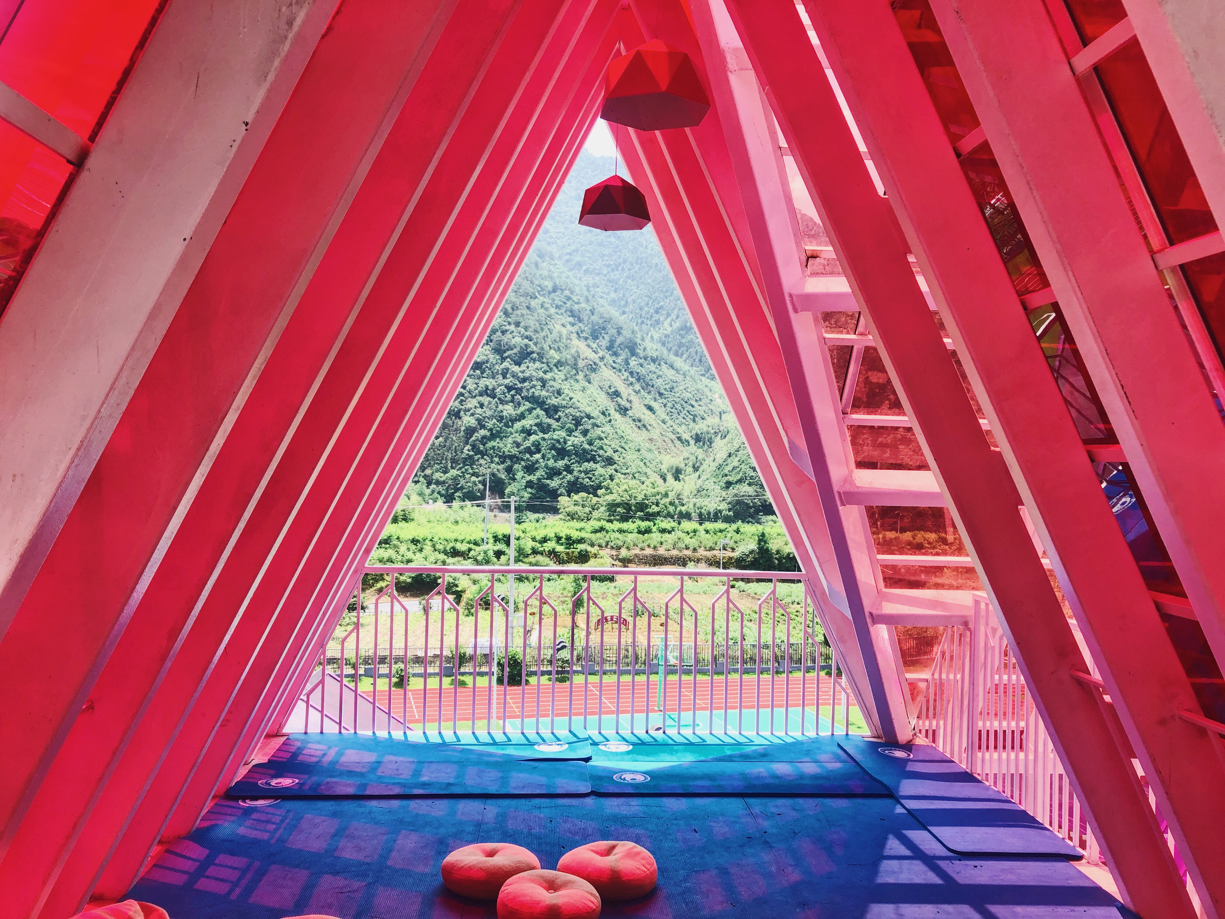 看了村子就很容易理解建筑师所选择的坡顶造型。村中不乏鳞次栉比的坡顶小楼房,红色、灰色、白色、黄色、蓝色的瓷砖、瓦板、涂料、波形板都有用到,虽然纯度和彩度都不及学校使用的热烈,但孩子们对这样的形态和颜色应该都不陌生。而且,在这个青山环绕的地方,远看学校如同一簇野花,也并没有与环境违和的感觉。