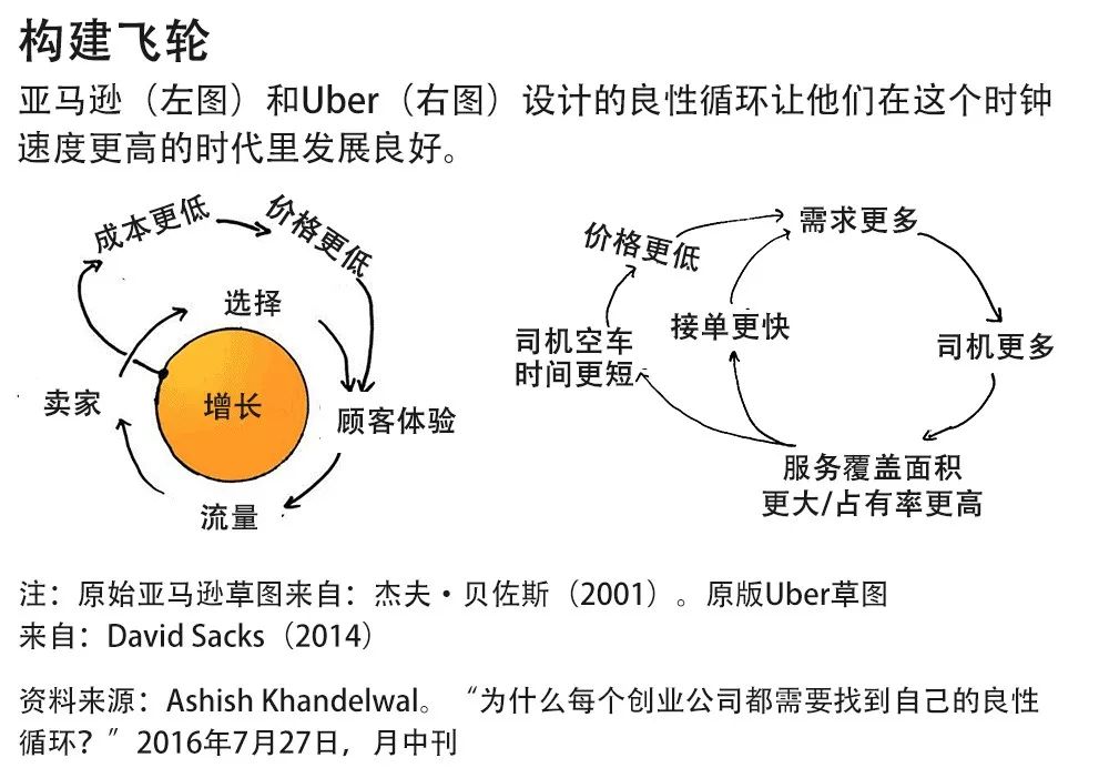 在亚马逊成为在线零售业的霸主之前,杰夫·贝佐斯在餐巾上画了左边这张图:更广泛的产品选择为顾客提供更好的购物体验,顾客数量增加吸引了更多的卖家和更多的流量,因此降低了成本,从而能为顾客提供更低的价格。正是这个良性循环帮助亚马逊获得成功。