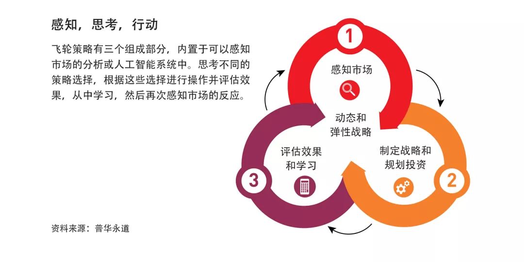 通过游戏的角度来观察战略,可以为构建动态战略计划提供新方法,增加战略制定过程中的远见和弹性。如下图所示,动态和弹性的飞轮策略有三个组成部分。