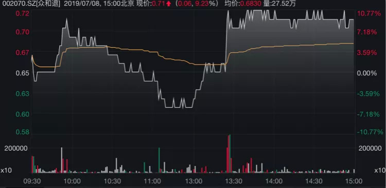众和的股价在最后一个小时仍有6次触及涨停,K线偶有下修。收盘前5分钟,众和股价从0.72元的涨停高位回落到0.70元。14:58分开始,众和快速上攻,最终收0.71元,涨9.23%,总市值为4.51亿元。