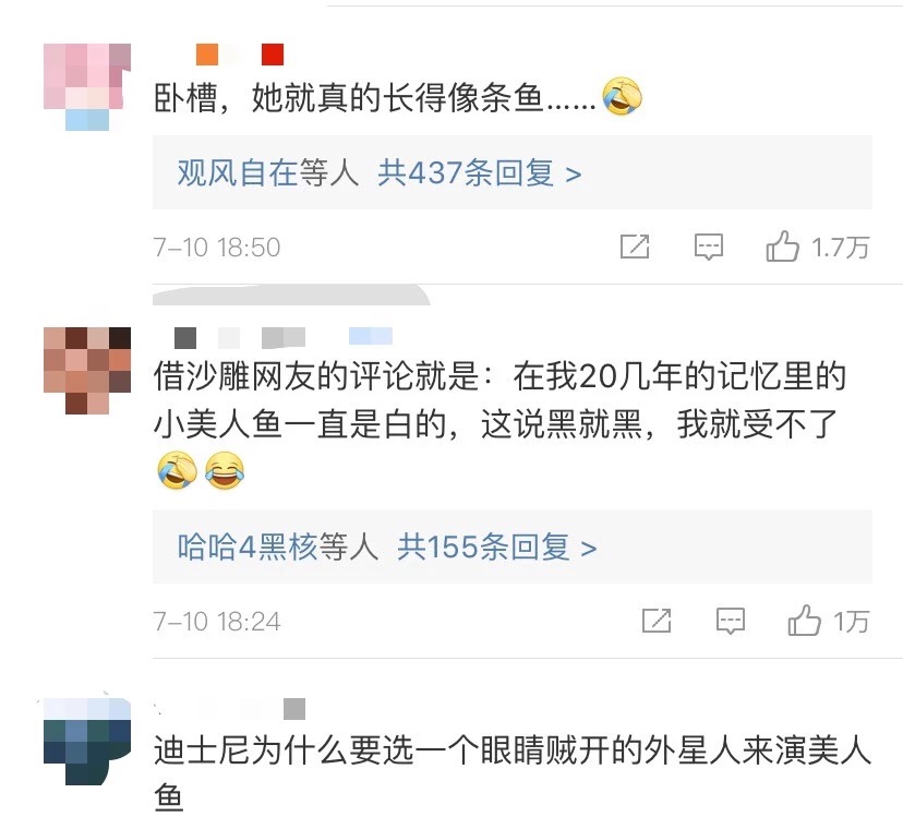 然而导演的这套说法,并没有得到广泛的认可。选角消息发布后,#NotMyAriel(不是我的爱丽儿)的标签在推特上热度猛增,国内对于这一选角的反对声音也一度在微博上霸屏,除了“毁童年”等批评外,甚至有人发出“太丑了”、“长得是挺像条鱼”等侮辱性的言语。而在肤色和面貌的评价之外,更有人指责迪士尼这一决定是在迎合好莱坞的政治正确,有些矫枉过正的味道。