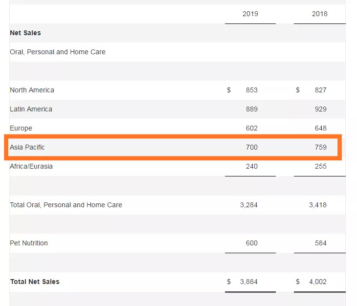 高露洁此次特意强调亚洲市场并非偶然。在今年第一季度,高露洁亚太地区的净销售额同比下降了8.0%,成交量下滑2.5%。尽管澳大利亚、印度、泰国和菲律宾的销量仍在增长,但由于占比较高的大中华区销量下滑,高露洁在亚太市场销售额减少了0.59亿美元(约合人民币4.05亿元)。