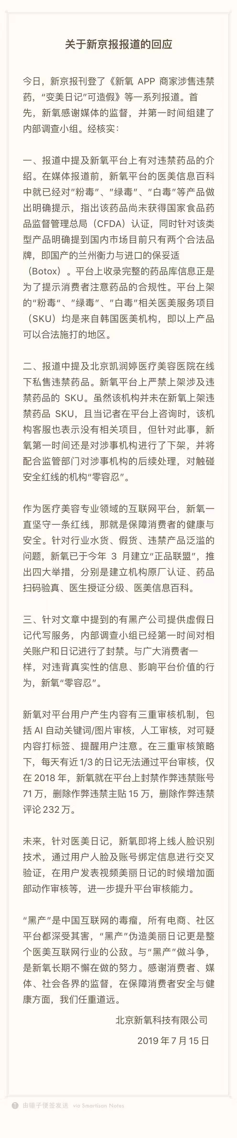 7月15日,新京报刊登《新氧APP商家涉售违禁药,“变美日记”可造假》,被多家媒体转载。