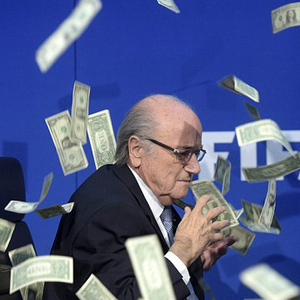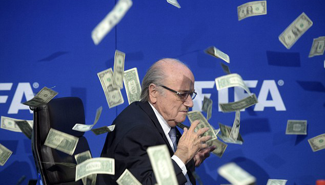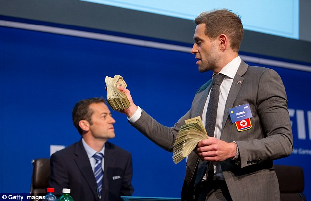 之后,布拉特宣布自己不再竞选下一任国际足联主席。安保人员带走这位喜剧演员前,后者向布拉特头上撒了一堆假美钞。