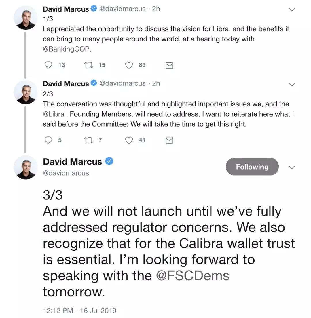 马库斯也在听证会结束后发 Twitter 再次强调:“在我们完全解决监管机构的问题之前,我们不会启动 Libra。 我们也认识到,对于Calibra钱包来说,信任是至关重要的。"