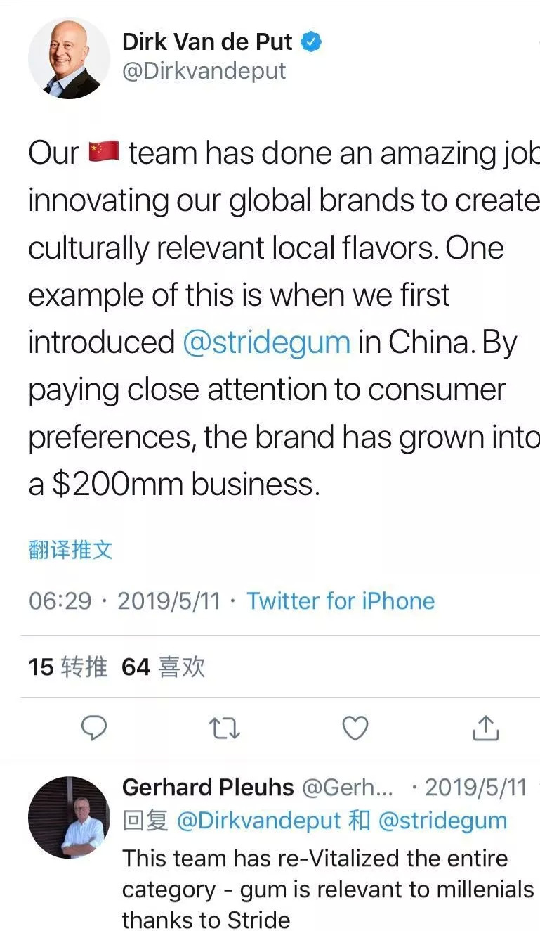 “在通过创新为全球品牌打造出契合本地习惯的口味上,我们的中国团队表现得十分出色……通过密切关注消费者偏好,(炫迈)这一品牌的规模已超过2亿美元(现约合13.76亿人民币)。”他在推特中写道。
