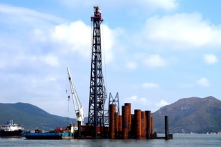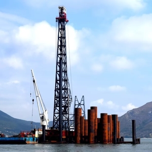 亚洲最先进的打桩船,由我国自主研发生产,海上最大打桩直径达到6米,并有GPS自动定位,将打桩误差控制在2厘米以内。