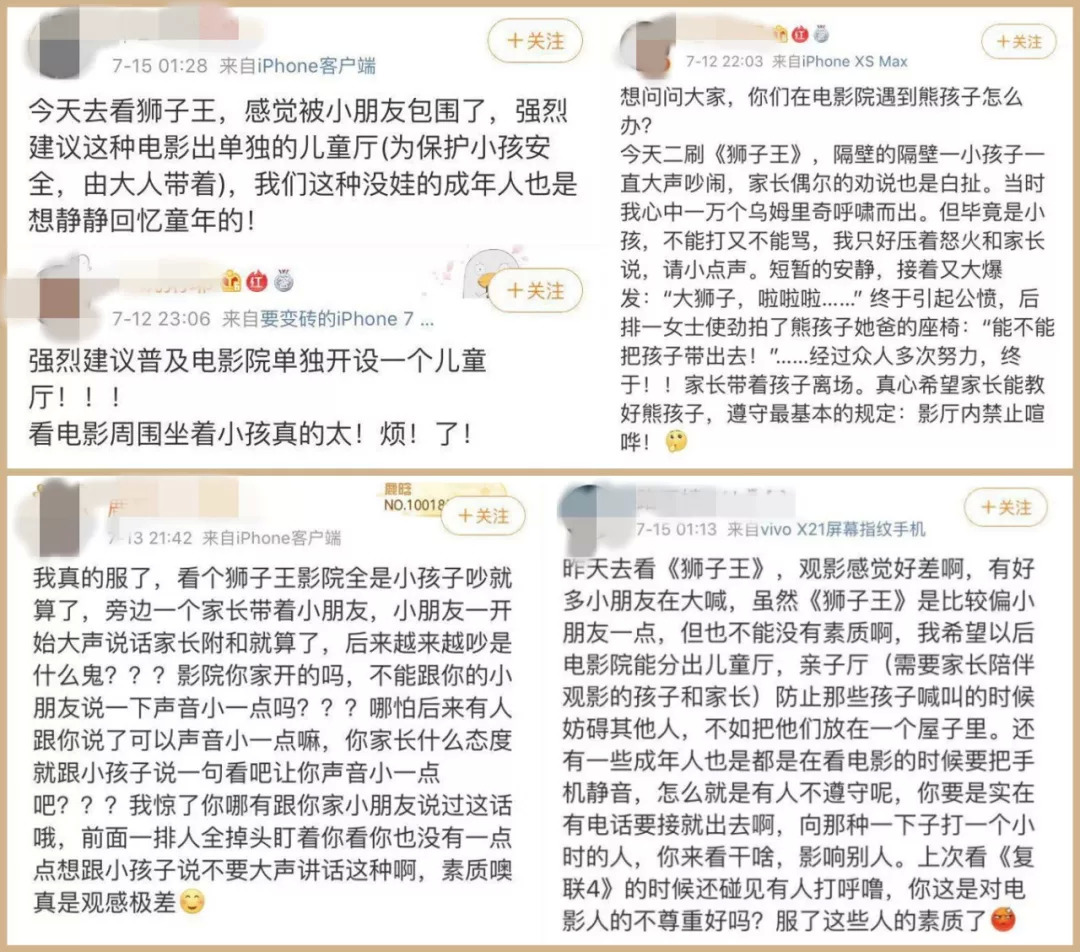 当国内电影市场步入了暑期档,影院也迎来了大批量的低龄儿童观众,对很多看过《狮子王》的观众来说,上述对话并不陌生。打开社交软件,在以“狮子王”为关键词的动态中,“熊孩子”、“吵死了”等字眼频频出现,更有网友直接总结道:看《狮子王》唯一的感受是,真的太吵了!