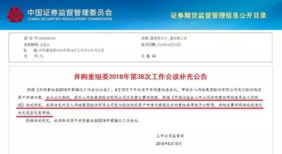 2018年8月10日,证监会发布公告表示,因巨人网络涉及重大事项检查,其收购Playtika项目将被予以暂停,待相关事项明确后视情况而定是否恢复审核。