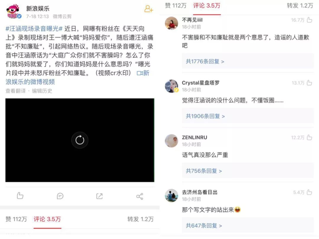 最先曝出的粉丝自述版本是这样的:《天天向上》录制时,有粉丝对王一博大喊“妈妈爱你”,汪涵怒斥“不知廉耻”。一时间,是汪涵没素养,还是“妈粉”言语不当,引发热议。
