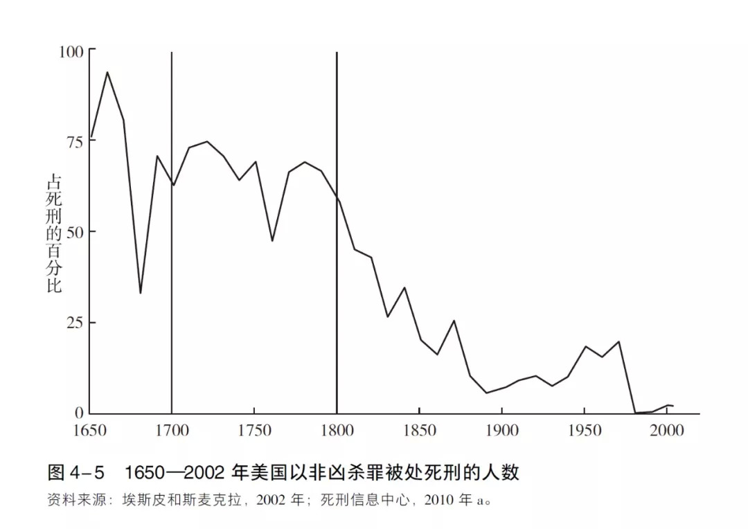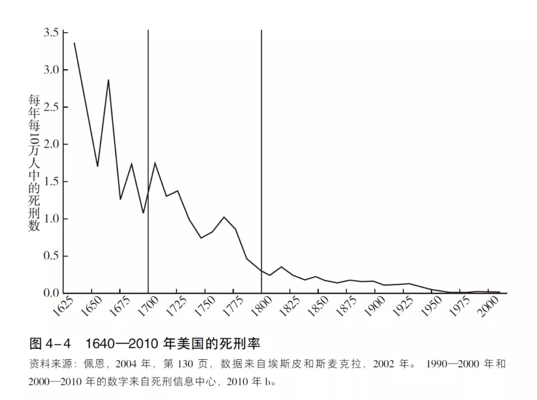 下图显示,自殖民地时代以来,美国的死刑率在总人口中的比重大幅下降,在17世纪和18世纪下降得最快,而那也正是其他形式的制度性暴力在西方迅速减少的时期。