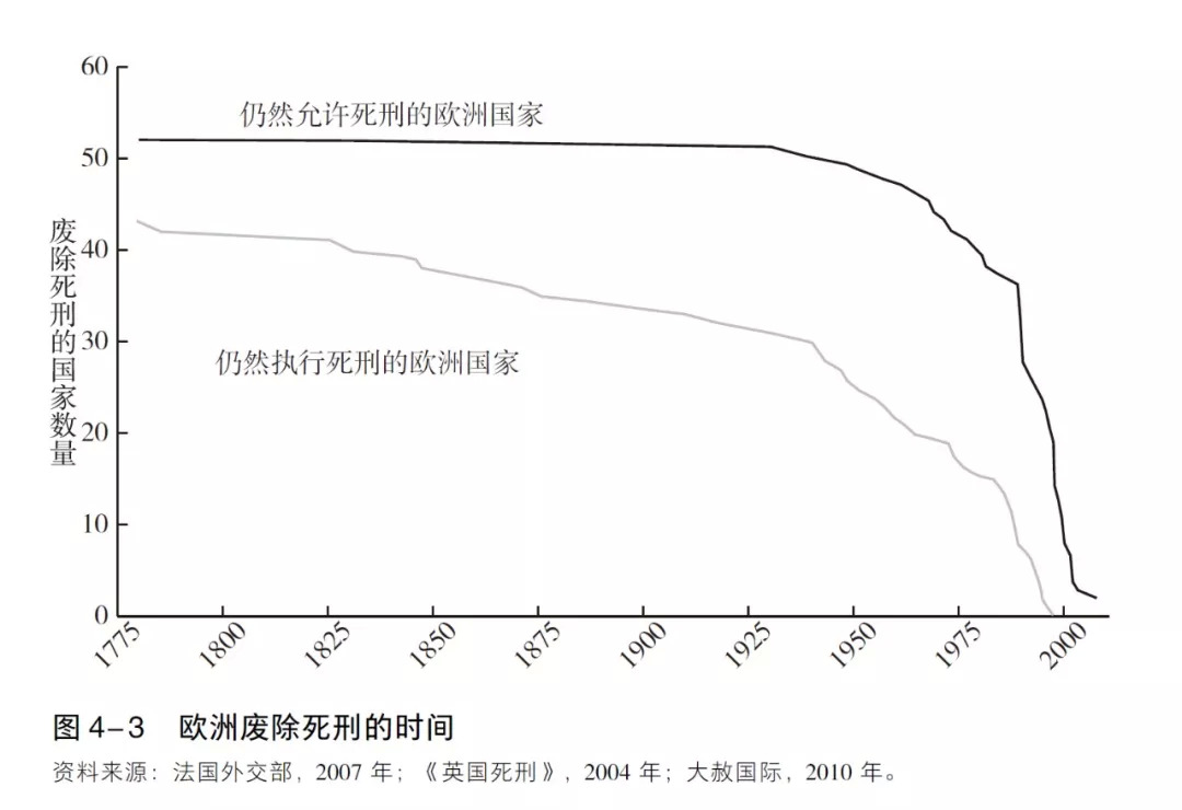 但是我们今天看见的事实是,废除死刑并没有打断数世纪以来凶杀暴力下降的趋势,而且当代西欧国家均已不再执行死刑,它们也是世界上凶杀率最低的国家。制度性暴力曾经被认为是维持社会运转不可或缺的手段之一,但一旦它被废除,社会照样运转良好。