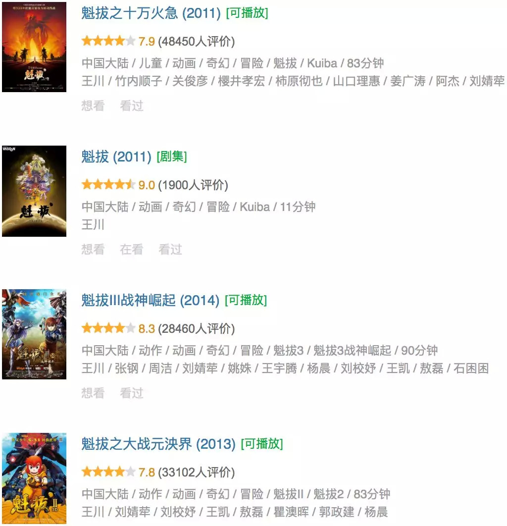 在此之前,不是没有优秀的国产动画电影。三部《魁拔》,豆瓣评分为7.9、7.8、8.2,票房仅305万、2535万、2425万。最好的票房不过是喜羊羊最差票房的三分之一。