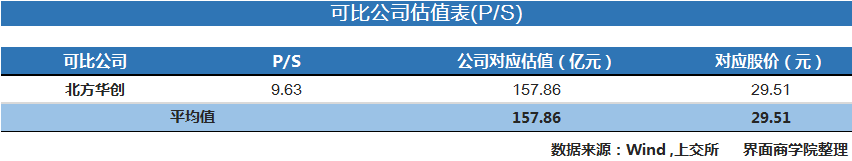 以北方华创为可比公司,采用市销率(P/S)估值方法。以北方华创2018年营业收入16.39亿元,307亿总市值,对应P/S 9.63X。据此,中微公司总估值约为157.86亿元,按照上市后5.35亿股测算,对应每股股价29.51元。中微半导体已公布发行价为29.01元/股。