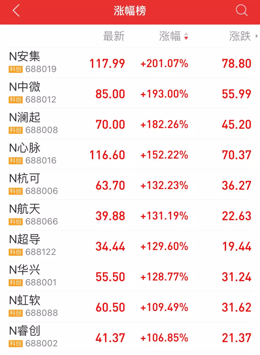 7月22日科创板开市后,市值第一股诞生,为中国通号。截至9点31分,涨幅排名前十如下。