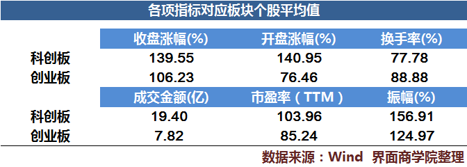 同时,科创板个股的分化情况也更加显著。科创板的个股收盘涨幅分布区间为84.22%至400.15%,而创业板为75.84%至209.73%,科创板的涨幅范围相当于创业板的两倍以上。从振幅上也可以看出,科创板个股的平均振幅要大幅高于创业板。