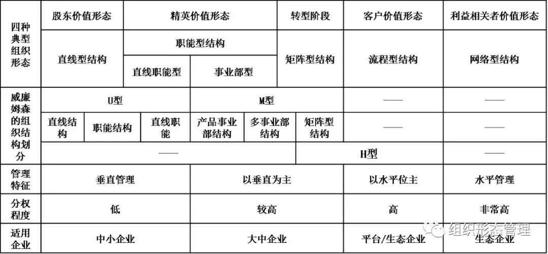 M型结构在强调垂直管理的同时,提出了分权管理,从高度集权变成了相对集权,研究样本应该是股东价值形态巅峰阶段的企业,这些企业通常是一些集团企业,开始走向了多元化、国际化的道路,因此主要涵盖了事业部型结构以及事业部矩阵型结构。U型结构强调垂直管理、集权管理,研究样本应该是从股东价值形态向精英价值形态迈进的那些企业,这些样本体现了工业1.0时代、2.0时代的组织管理特征,因此涵盖了直线型组织结构、直线职能型结构。