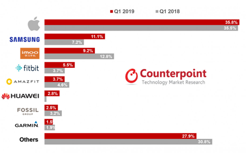 据之前Counterpoint发布全球2019年Q1智能手表统计数据显示,榜单第一位的依然是苹果,其市场占有率为35.8%,前六的位置共有三家中国企业,分别是排名第三,以儿童智能手表主的步步高;排名第五主的华米和第六位的华为。