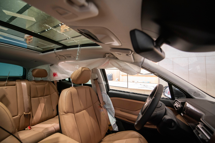 侧碰发生时,碰撞冲击力通过多条加强横梁,向外传递。底盘横置的加强横梁保证乘员与电池在侧碰冲击下的安全,此外前后防护枢纽也能够起到侧向支撑的作用,在偏头、尾的侧向碰撞中一同维护整车安全。