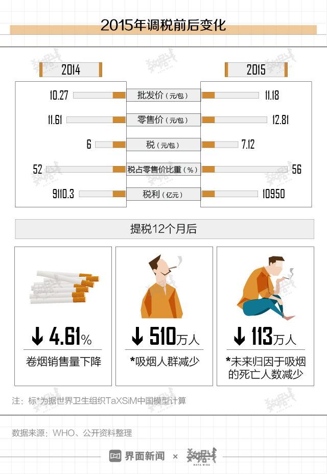 中国最近一次调整烟草税是在2015年5月。与2014年相比,2015年一至五类烟的批发价格和零售价格均有所增长。税占零售价比重从52%上升至56%,税利从9110亿元升至10950亿元。