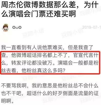 7月17日,豆瓣小组“自由吃瓜基地”有组员发帖提问:“周杰伦微博数据那么差,为什么演唱会门票还难买啊?”