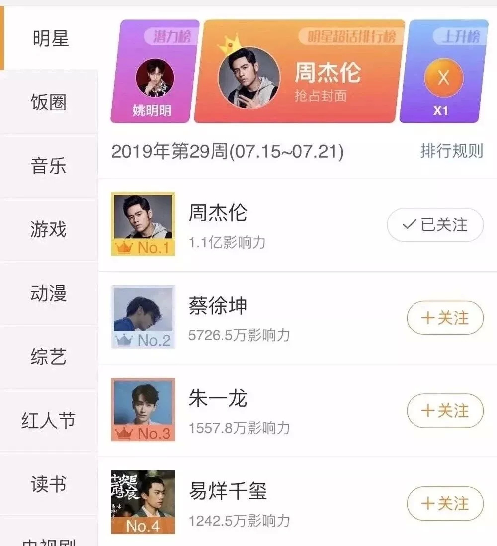 不过,周董的群众基础毕竟是压倒性优势,连政府官博、明星网红、大V们都为其站台。双方胶着16小时后,周杰伦超话终于在7月21日0:30分登顶,超越了霸榜几十周的蔡徐坤。刹不住闸的杰迷,还为偶像创下了“史上第一个超话影响力破亿”纪录。