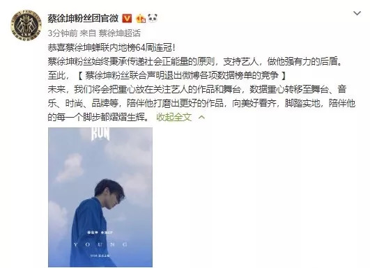 一场国民明星与流量偶像的数据对决,以“蔡徐坤粉丝退出微博榜单竞争”暂告段落。然,中场无战事,流量无终局。