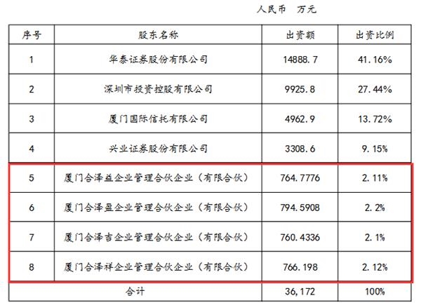 本次股东增资由华泰证券、深圳投控、厦门国际信托、兴业证券等四家原股东和厦门合泽吉企业管理合伙企业(有限合伙)等四家作为员工持股主体的新股东共同实施。员工通过四家有限合伙企业合计间接持有公司股份8.53%。