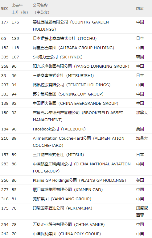 排名提升最快的TOP20中,有11家中国公司,包括碧桂园、阿里巴巴、阳光龙净集团、腾讯、苏宁、中国恒大、中国航空油料集团、厦门建发、兖矿集团、万科以及保利集团等。