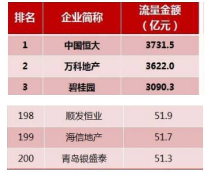 还看2016年中国房地产企业销售额排行榜TOP200,恒大、万科与碧桂园分别以3731亿、3622亿以及3090亿位居前三,是第198至200名顺发恒业等51亿左右的60-70倍(见下图)。