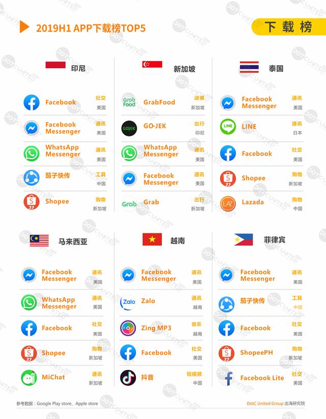 统计2019年上半年各国Google Play Store & iOS App Store下载榜TOP5显示,各国头部产品基本集中在社交、通讯和购物三大品类,主要来自美国、中国和新加坡等国家。整体来说,美国社交应用Facebook基本统治东南亚移动社交领域;Facebook Messenger、WhatsApp 和LINE等领衔通讯市场;Shopee和Lazada无悬念制霸东南亚移动电商市场。