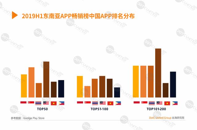 对比东南亚六国下载榜TOP200中中国APP的排名情况,整体而言,中国APP在各国TOP200中平均上榜48款。TOP50中,印尼、泰国和越南榜单中的中国APP数量较多,有10~15款左右。从整体排名来看,印尼榜单中中国游戏排名最靠前,TOP100中中国APP占到三分之一,印尼市场对中国APP的包容度由此可见。