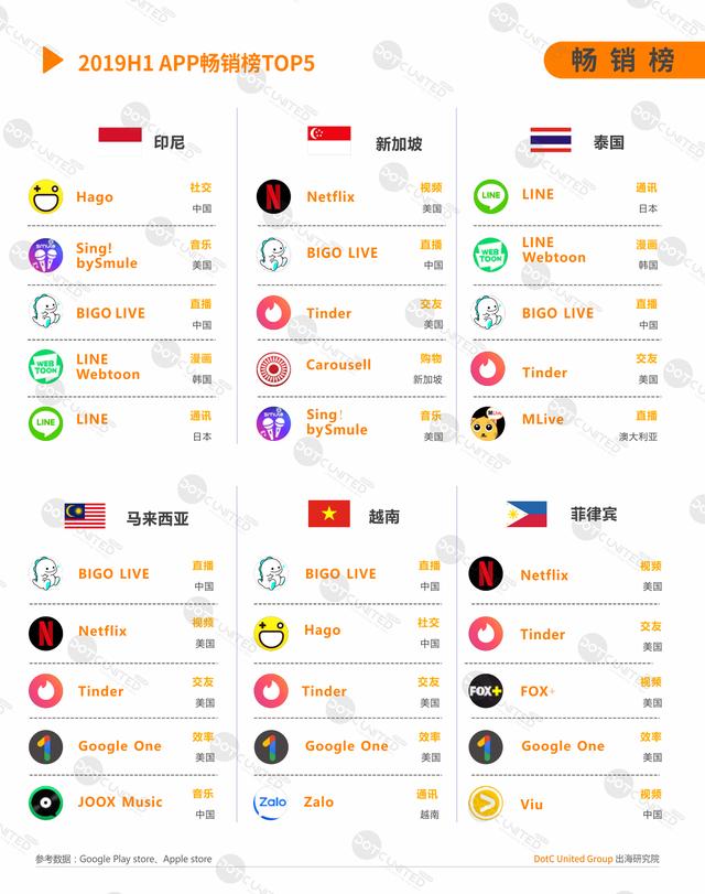 统计2019年上半年各国Google Play Store & iOS App Store畅销榜TOP5显示,各国头部产品基本集中在直播、流媒体服务(音乐&视频)以及交友等品类,产品主要来自中国和美国。整体来说,美国视频流媒体Netflix、中国直播应用BIGO LIVE、美国交友应用Tinder、音乐流媒体Sing!by Smule以及网盘Google One是东南亚地区上半年最畅销的APP,在各自领域称王称霸。